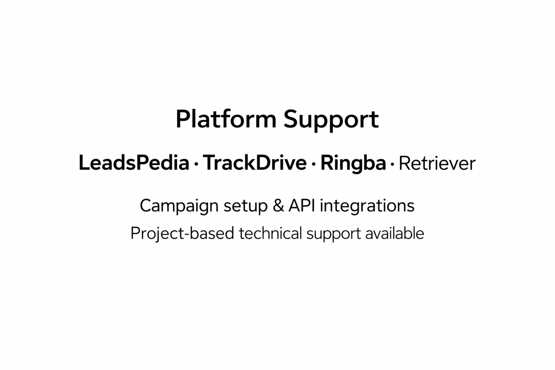 tech support for platforms like Leadspedia, Trackdrive, and Retriever.